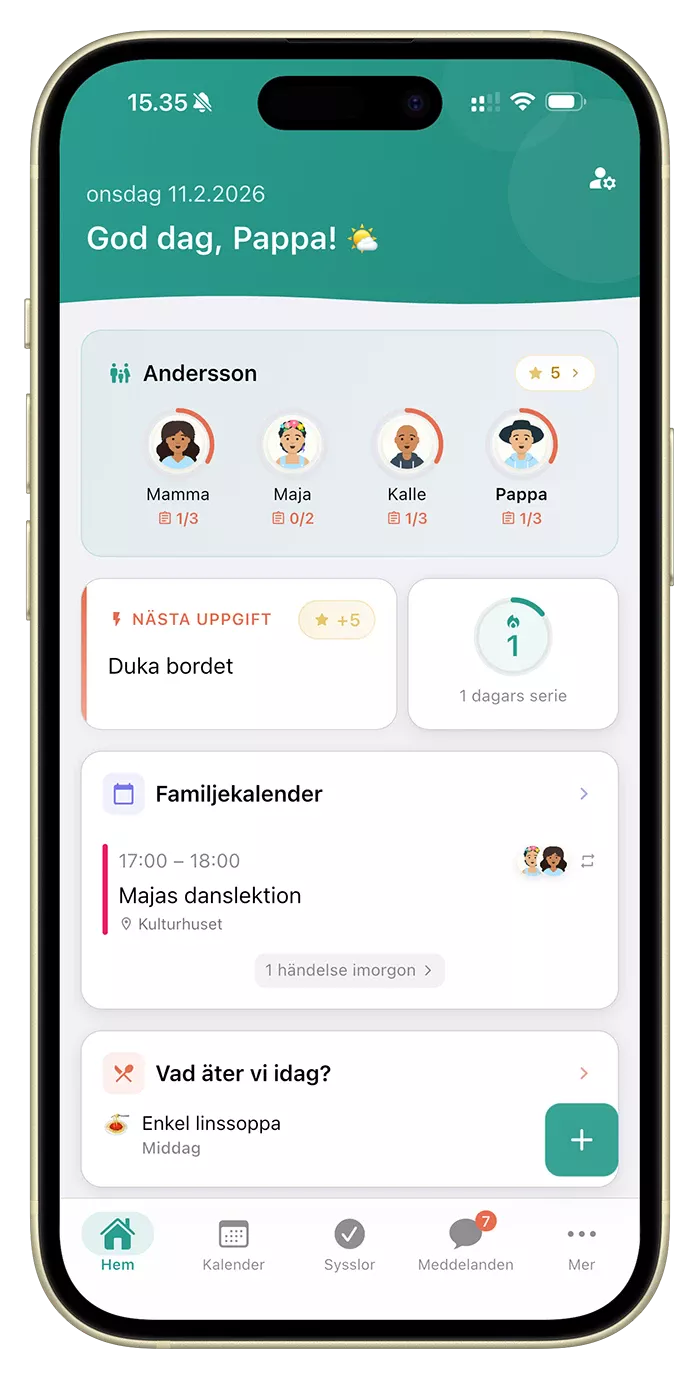Perhe.app samlar kalender, sysslor, meddelanden och veckomeny i en trygg app för hela familjen. Ladda ner i din appbutik och prova gratis i 28 dagar.